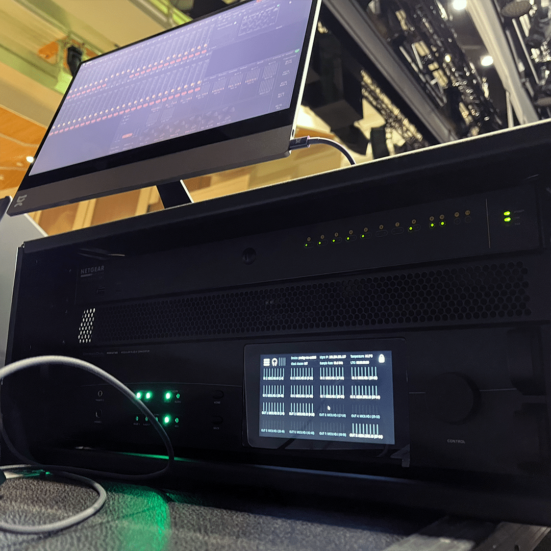 Dante-kortit on liitetty Netgear M4250 -kytkimeen. “Switch on kyllä toiminut, mutta lämpö ja siitä johtuva tuuletinmelu saavat miettimään hiljaisempaa ratkaisua työympäristöihin”, hän toteaa.