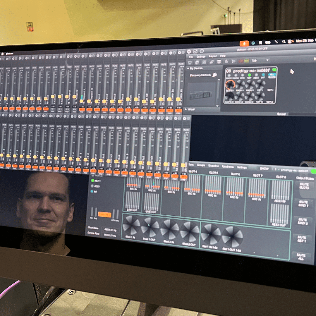Ollin valintaperusteet PRODIGY.MC:lle olivat selkeät: kompakti koko ja kahdennetut Dante-portit. Toisena vaihtoehtona olisi ollut huomattavasti suurempi (2 x 5U) ja raskaampi kokonaisuus, mutta nyt kaikki tarvittava mahtuu yhteen 4U:n räkkiin – sisältäen kaikki olennaiset I/O-, IP-, BNC MADI- ja BNC wordclock-liitännät.