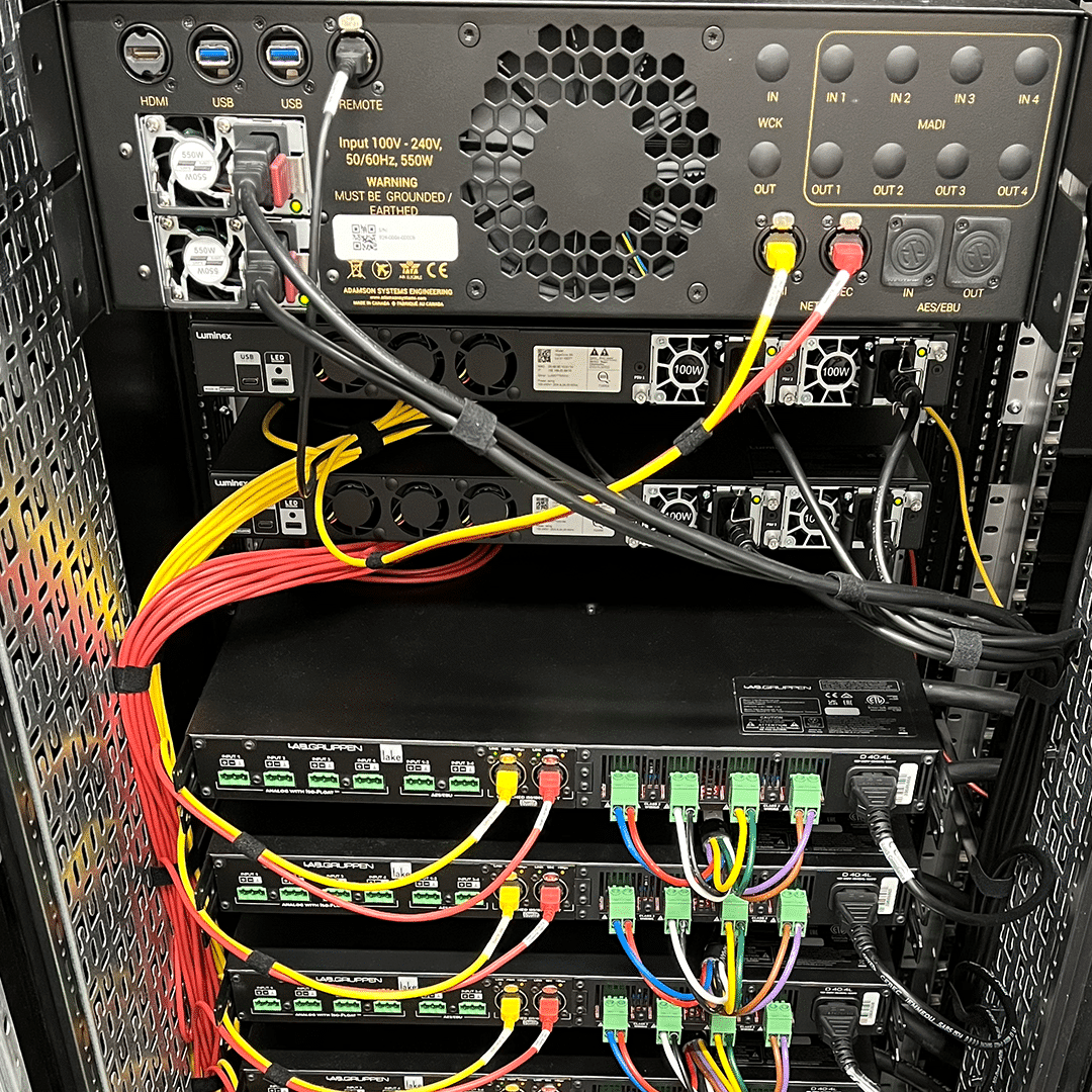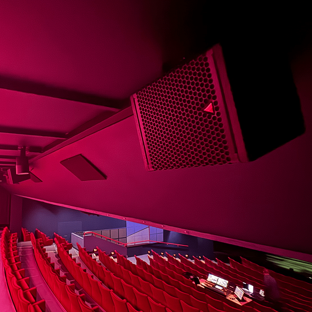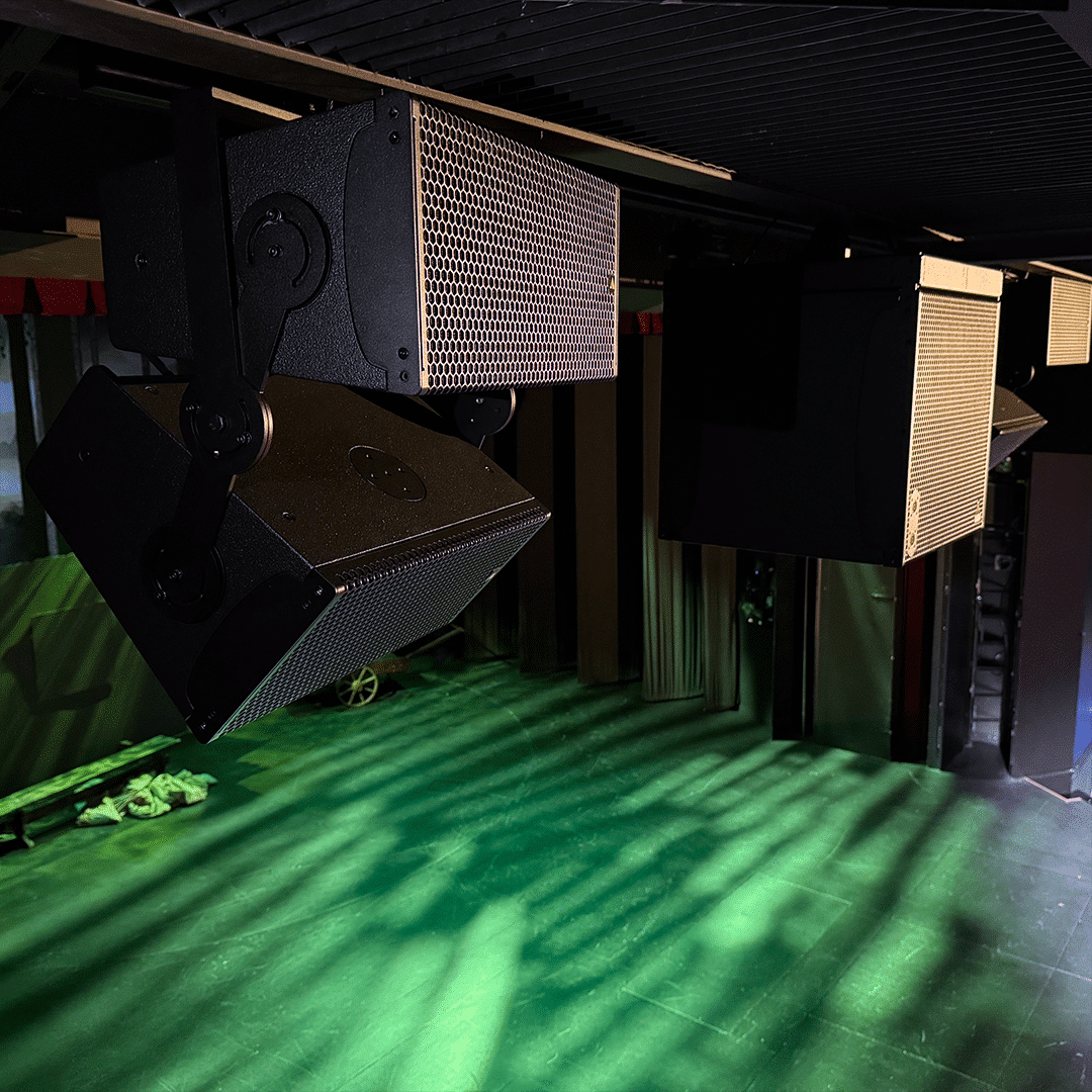 Järjestelmän mittakaava on huomattava: yhteensä 55 kaiutinta, joista pääkaiuttimina toimii riveittäin lavan etuosaan asennetut Adamson IS7p point source -kaiuttimet. Niiden väliin sijoitettiin IS118-subwooferit, ja lavan sivuille tuotiin vielä suuremmat IS219-subit, jotka hoitavat alimmat oktaavit ja tuovat lisää mörinää tehosteisiin. Katsomon ympärille asennettiin 17 surround-kaiutinta, ja salin muodon vuoksi tehtiin lisäksi kolme viivelinjaa, joista yksi palvelee takasurroundeja.