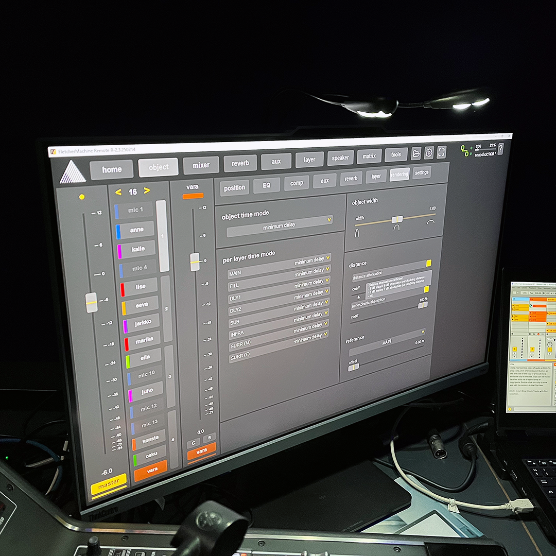 Uusi kokonaisuus muodostaa järjestelmän, joka on teknisesti monimutkainen, mutta jonka tarkoitus on tehdä esityksen äänestä luonnollinen ja huomaamaton. Ja juuri tässä FletcherMachine astuu kuvaan: se laskee jokaiselle äänilähteelle viiveet ja tasot niin, että ääni tuntuu tulevan sieltä missä näyttelijä tai soittaja kulloinkin todella on. Äänimestarit joutuvat toki ohjelmoimaan kaikki siirtymät manuaalisesti etukäteen, ja esityksen taustalla pyörii jatkuvasti valtava määrä prosessointia – mutta lopputulos on kuulijalle huomaamattoman luonnollinen.